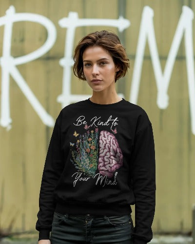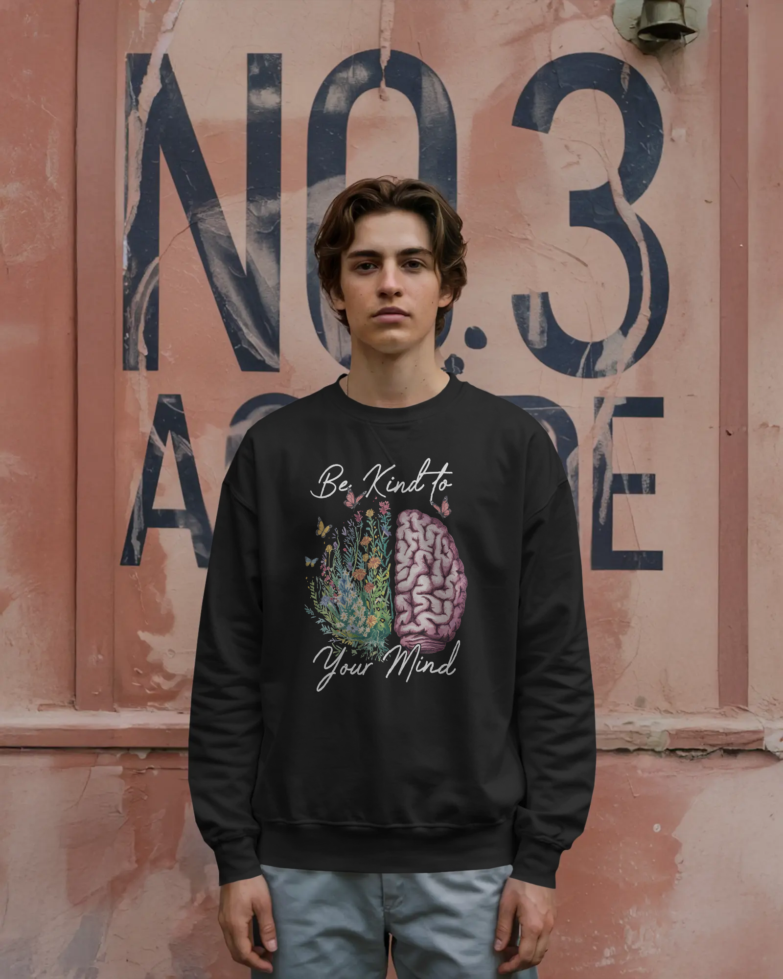 This unisex black crewneck sweatshirt features the empowering message "Be Kind To Your Mind," promoting mental health awareness with every wear. Crafted for comfort and inclusivity, it encourages kindness and self-care, making it a meaningful addition to your wardrobe or a thoughtful gift for someone you care about.