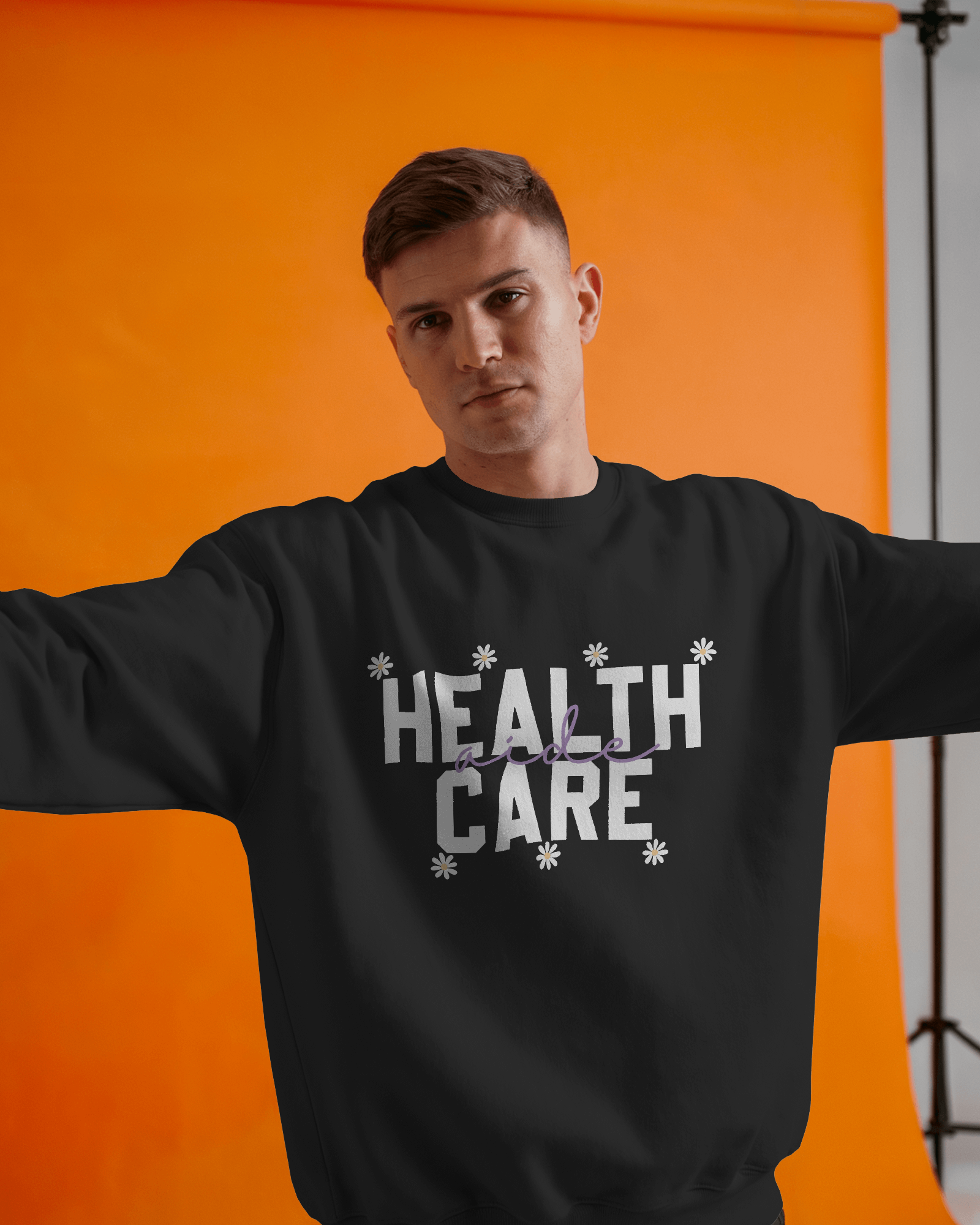 This unisex sweatshirt is tailored for healthcare aides, offering a comfortable and durable option for demanding work environments. Made from soft fabric, it provides warmth and a flexible fit that supports unrestricted movement. Designed for all-day wear, this sweatshirt combines practical functionality with professional style to meet the needs of healthcare professionals.