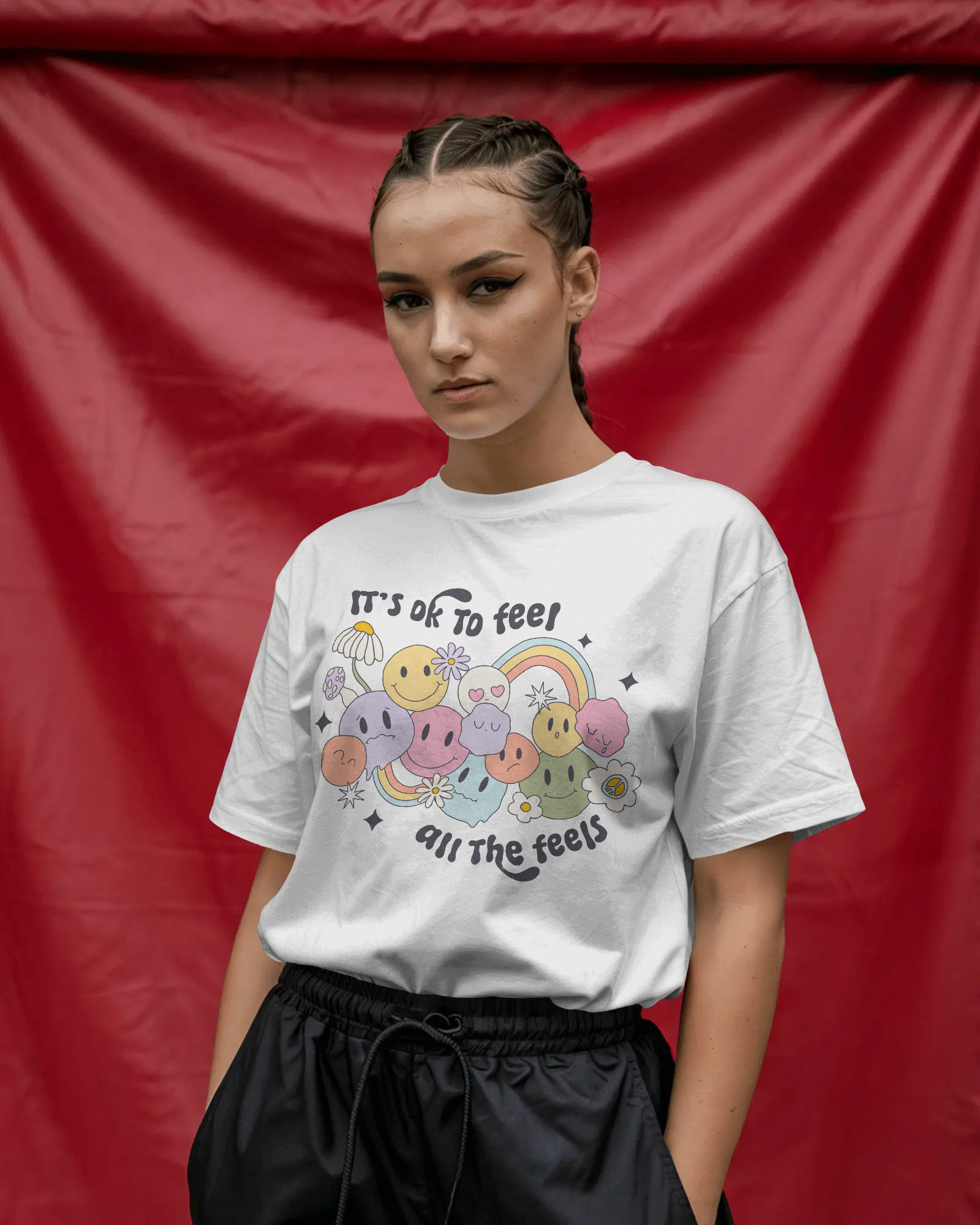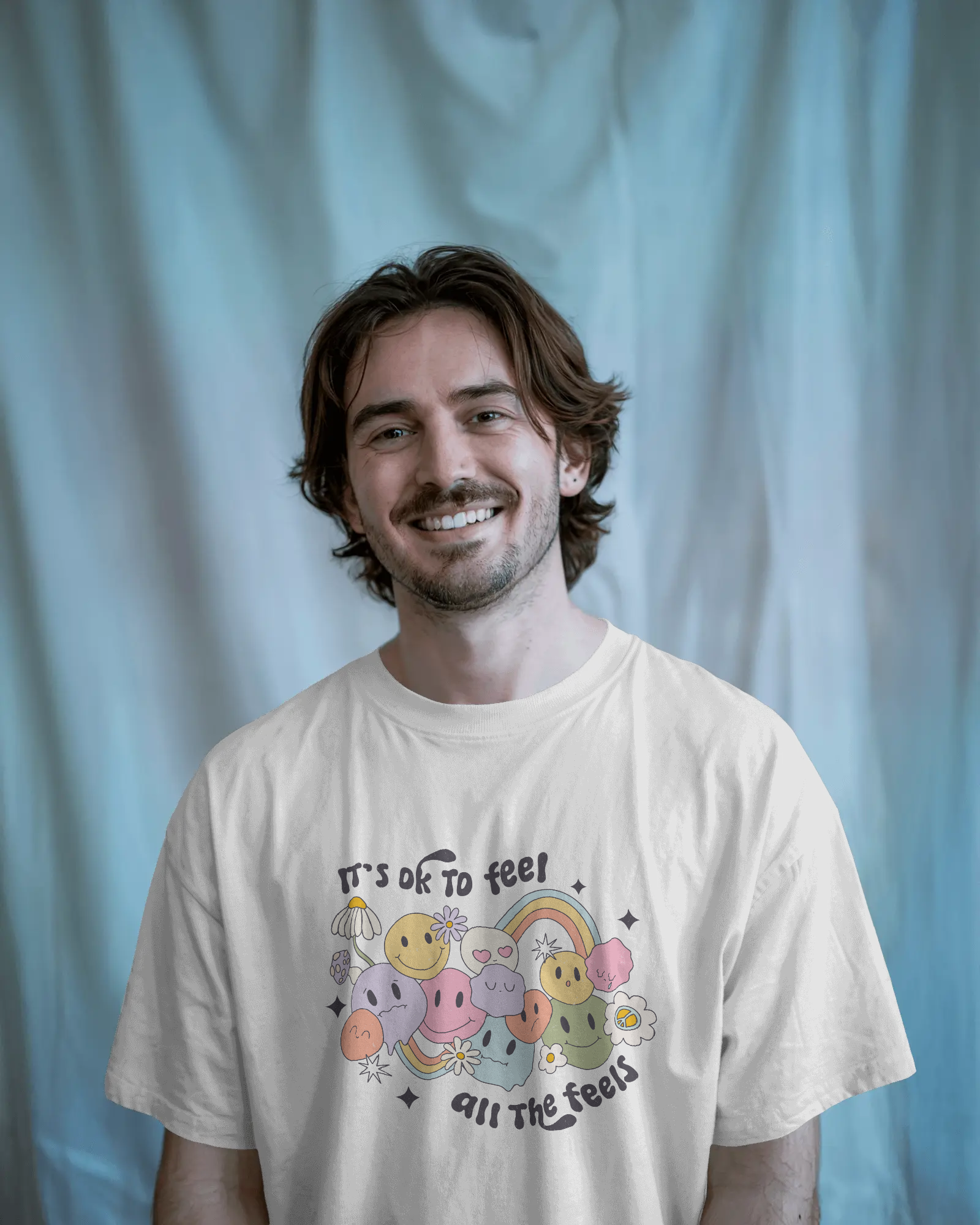 Boost your mental health and stay positive with our "It's Ok to Feel All The Feels" t-shirt. Embrace your emotions and take care of your well-being with this comfortable and meaningful t-shirt. Let the world know that it's ok to feel and understand your feelings.
